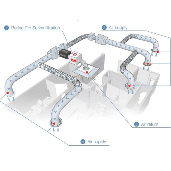 The IQAir Perfect 16 is a fan-less air filter system is designed to be installed in combination with new or existing air-con or heating HVAC systems. The special feature of the Perfect 16 system is its uniquely low airflow resistance combined with very high filtration efficiency (≥ 95%). In fact, the Perfect 16 offers the closest thing to HEPA-filtration without the very high and detrimental airflow resistance associated with normal HEPA-filter installations in ventilation ducts.